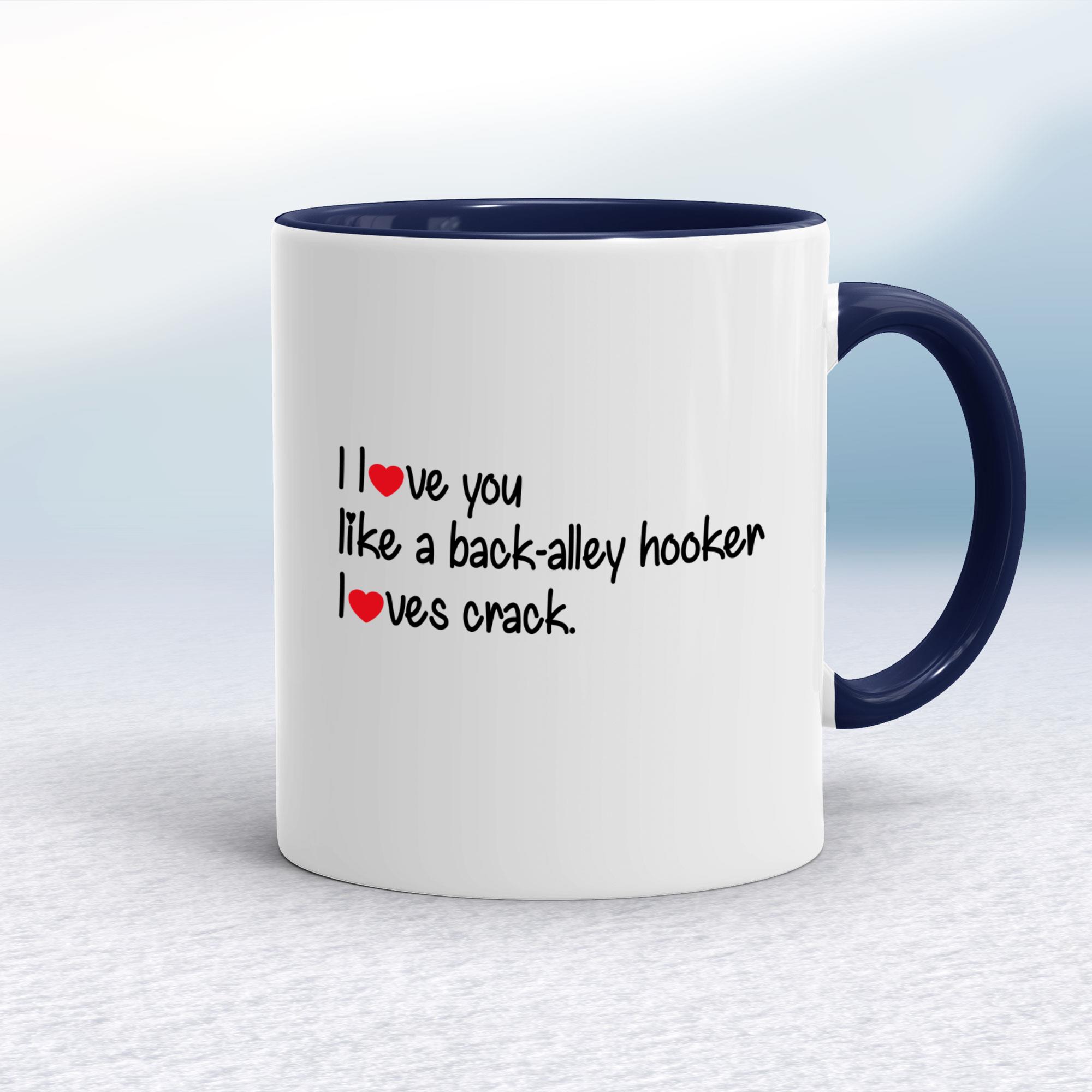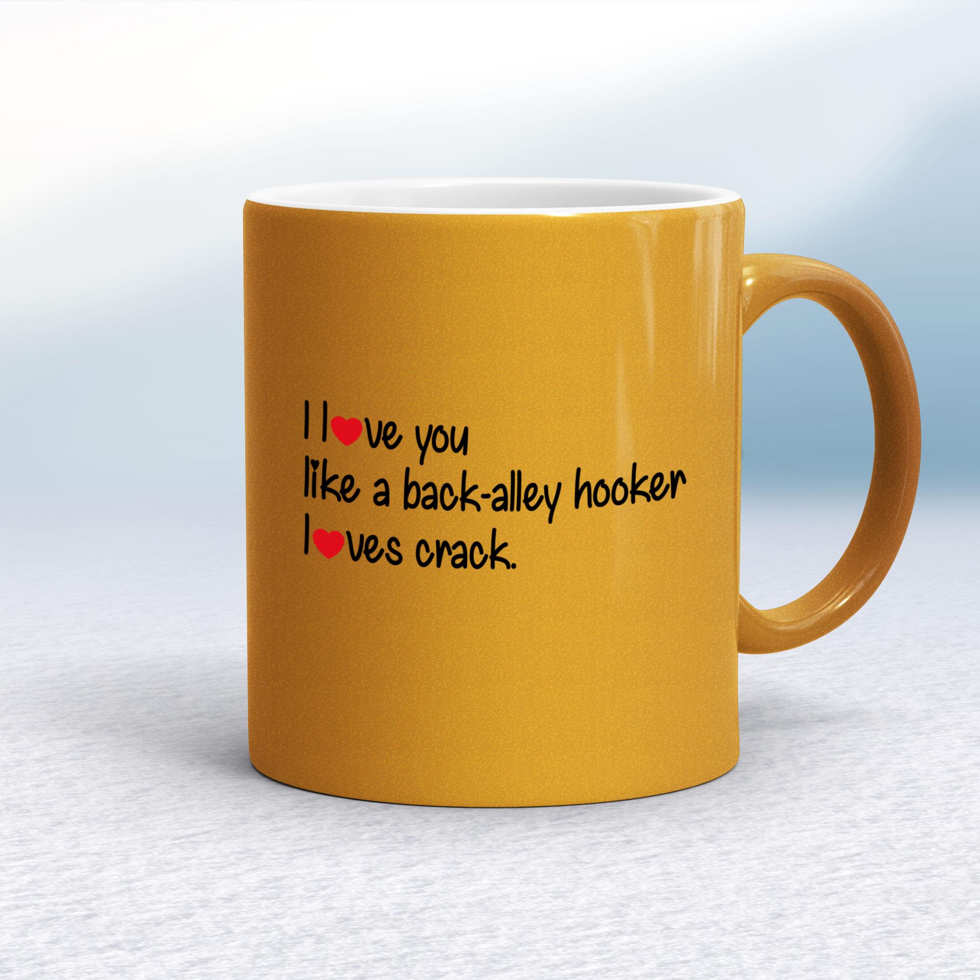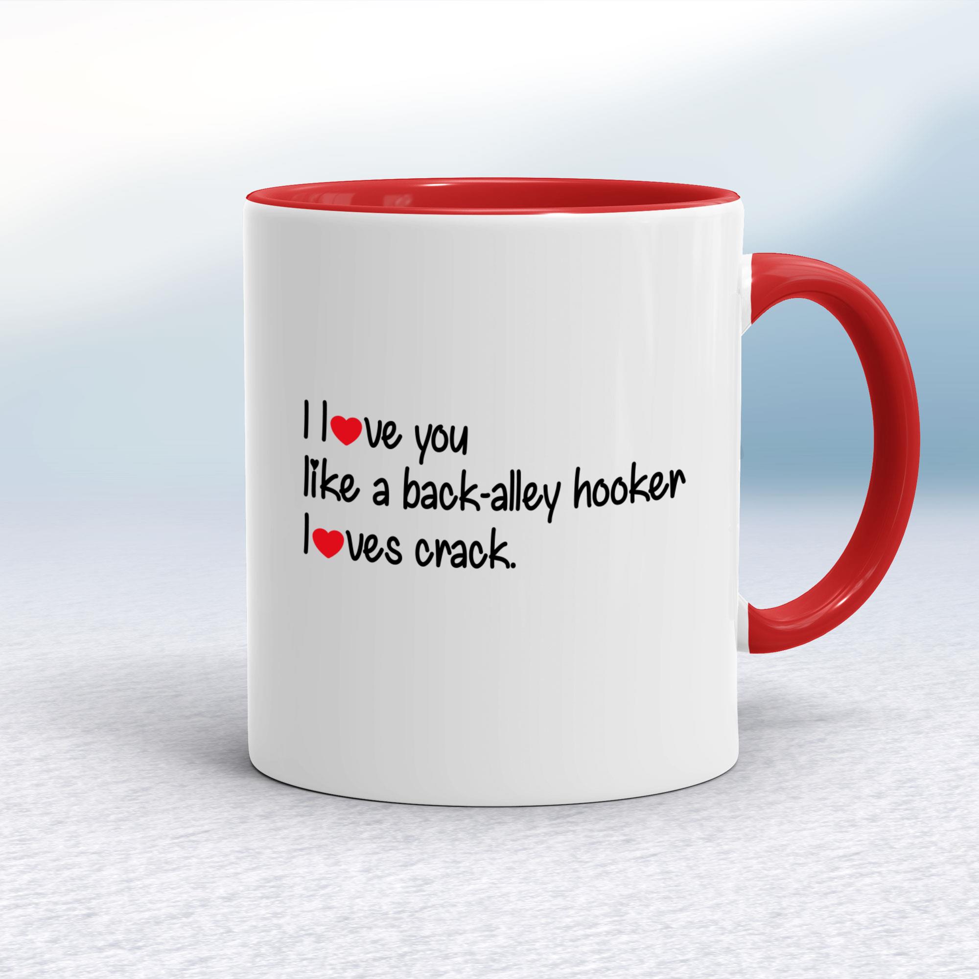 Our Back-Alley Hooker mug is hand-printed on both sides (front/back) of a high-quality mug and is available in a variety of styles and colours.