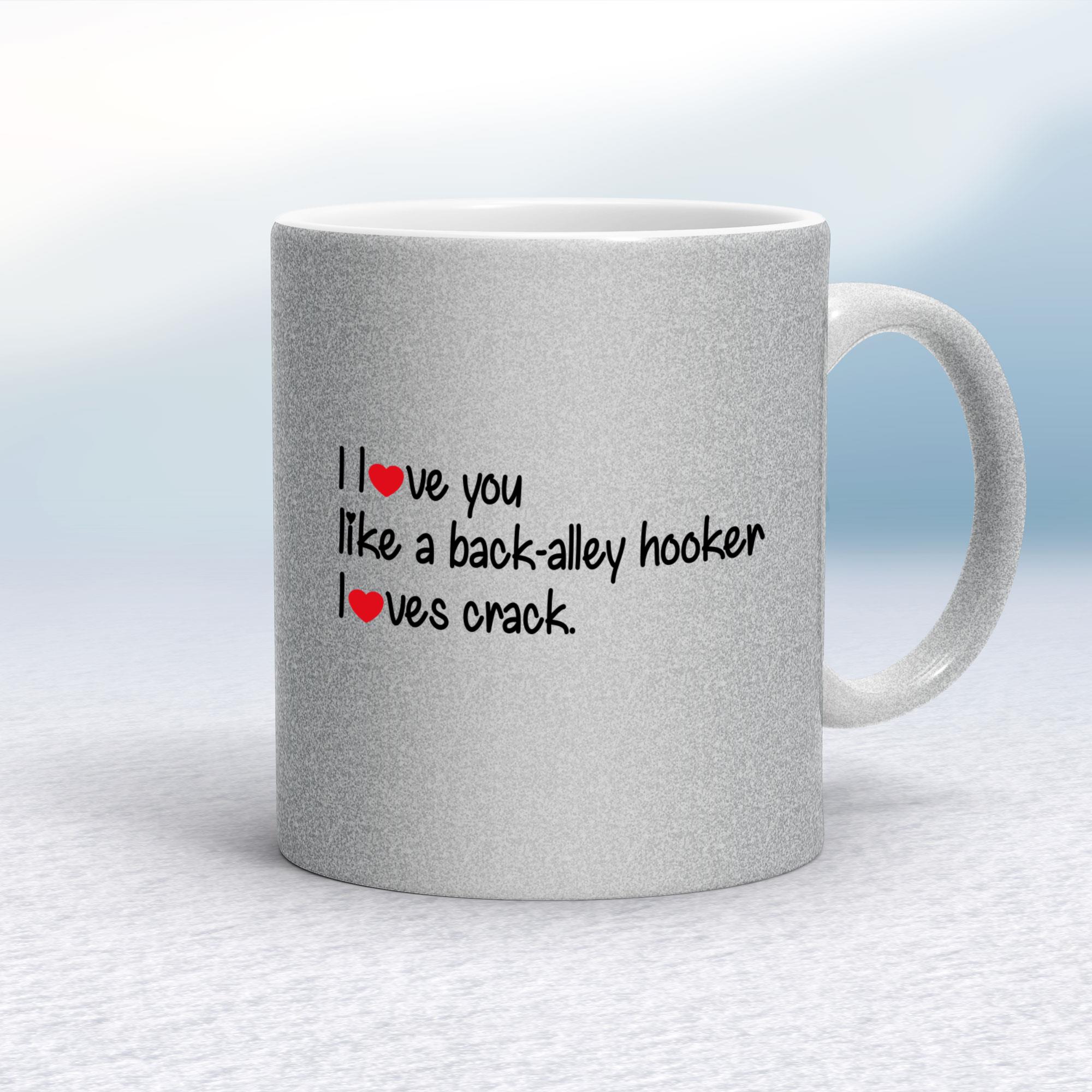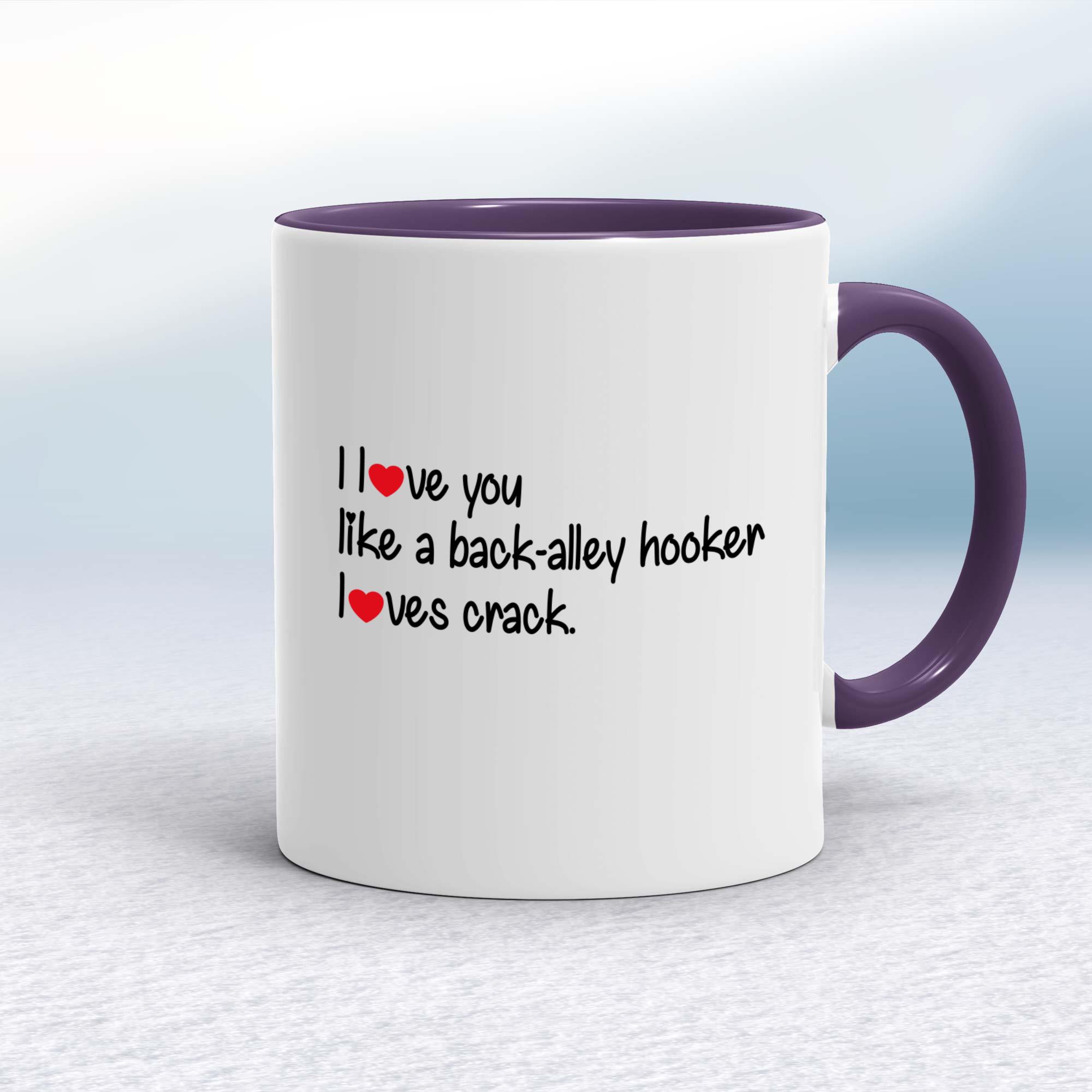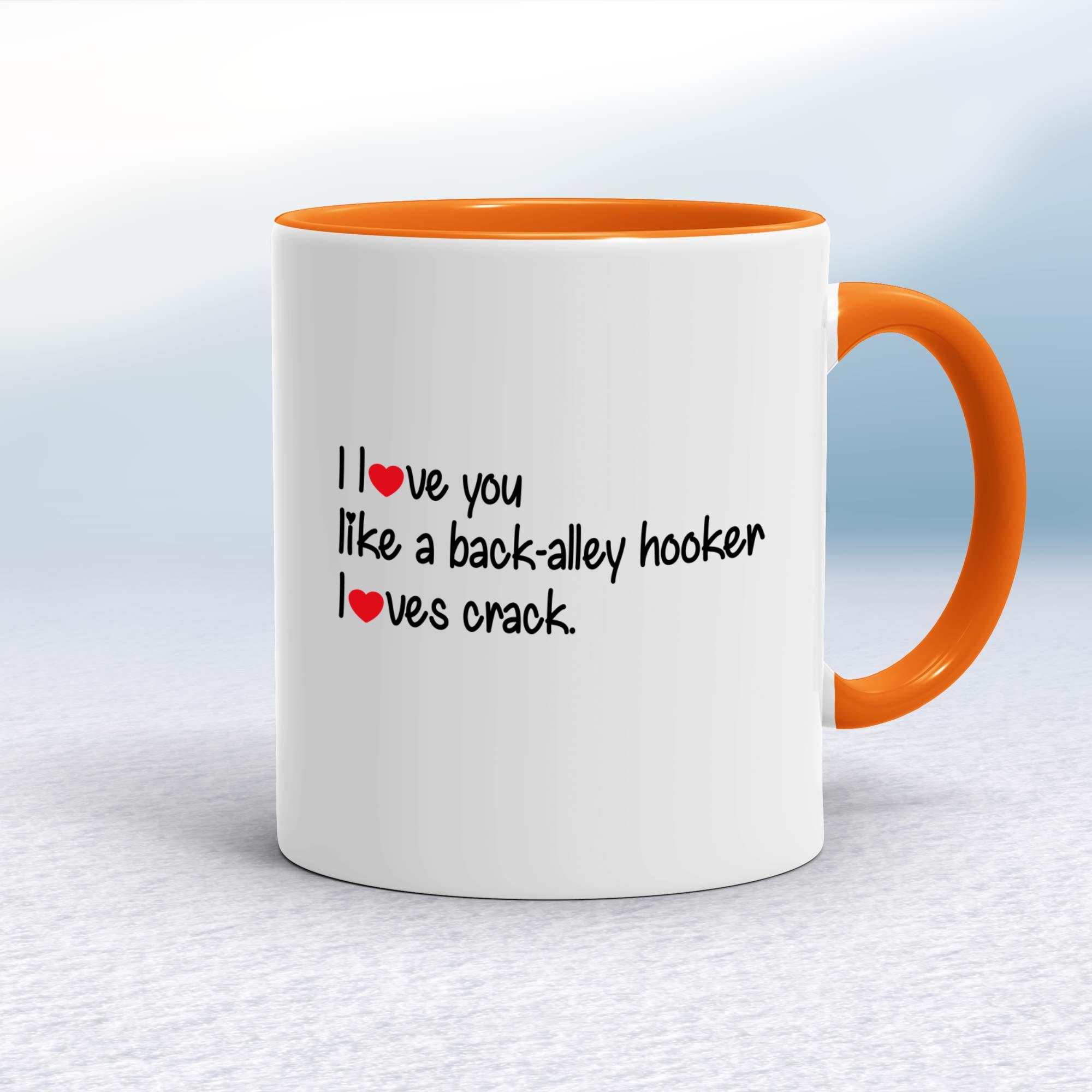 Our Back-Alley Hooker mug is hand-printed on both sides (front/back) of a high-quality mug and is available in a variety of styles and colours.