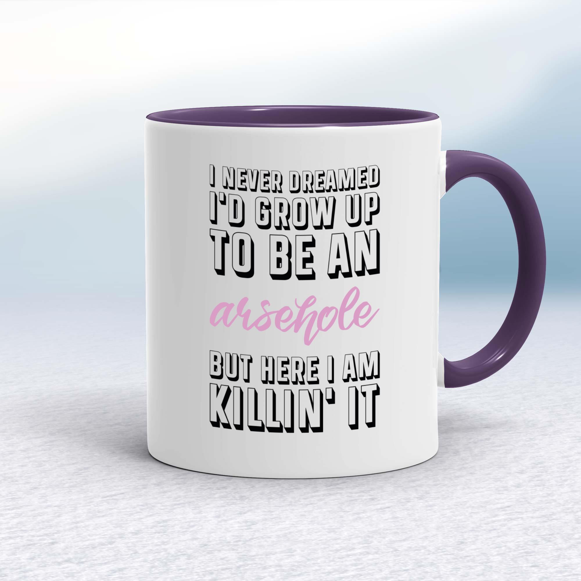 Our Grow Up To Be An Arsehole mug is hand-printed on both sides (front/back) of a high-quality mug and is available in a variety of styles and colours.