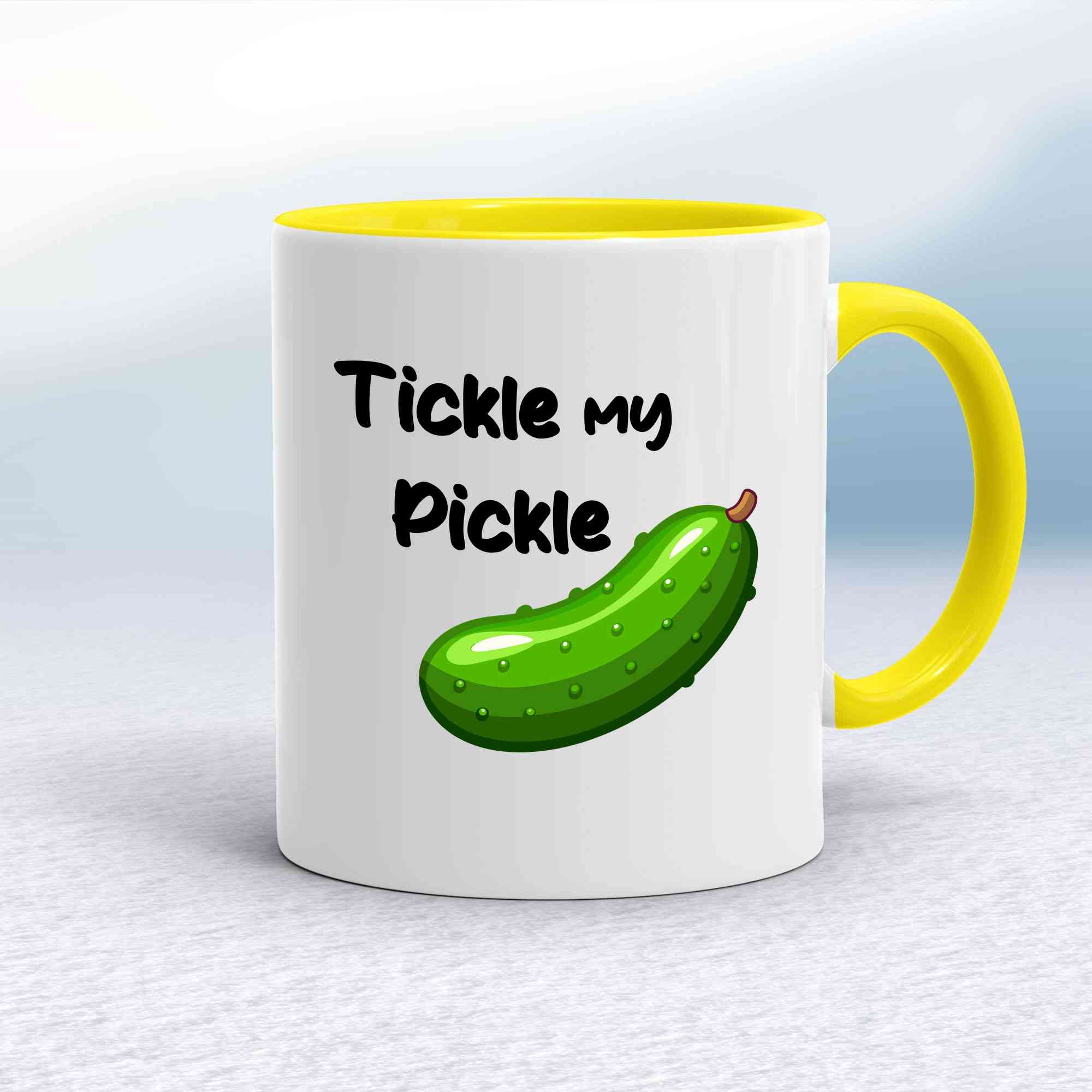 Our Tickle My Pickle mug is hand-printed on both sides (front/back) of a high-quality mug and is available in a variety of styles and colours.